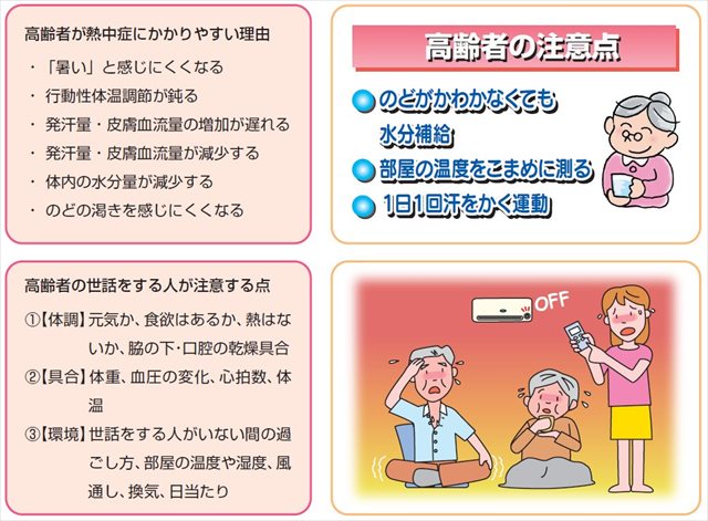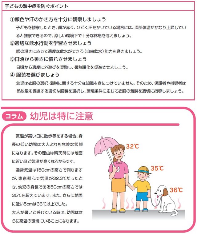高齢者や子供の注意点が書かれています。ちょっとした変化を見逃さず、細かい部分に気を配り、対策を徹底することが大切です。