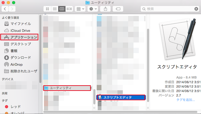 ▼ まずは「アプリケーション」→「ユーティリティ」を選択し、「スクリプトエディタ」を開きます。