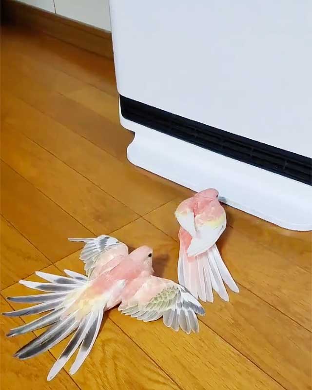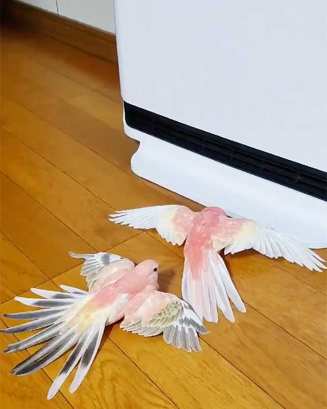 2羽のインコちゃんが静止したまま羽根を広げている…。何がおこったかと思ったら、ストーブの前で暖をとっているんですって!これまで冬になると犬や猫がストーブの前で暖まる光景は幾度となく目にしてきましたが、まさかこんな小さなインコちゃんが羽根を広げて暖をとるなんて…