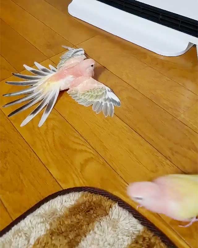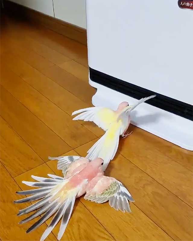一体何が起こった!?…羽根を広げて静止しているインコちゃんたちの目的は?