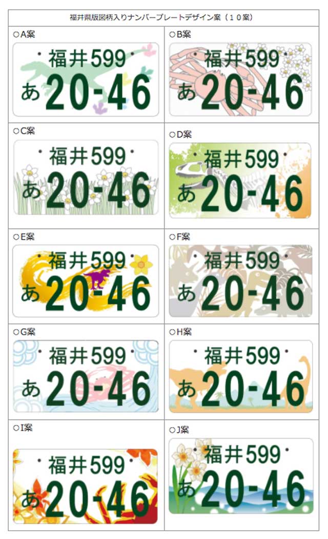 エントリーされた「福井県版図柄入りナンバープレートデザイン案」がこちら。どのナンバープレートも素敵ですが、この段階でも恐竜が5案も出されていますね。