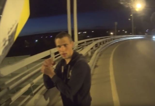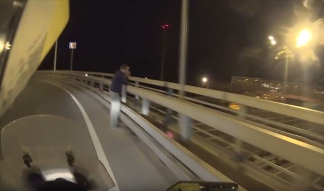 そして、ちょっと進んだあたりでバイクをとめます。なんと、右上に飛び降りようとしている一人の男性がいます…!!