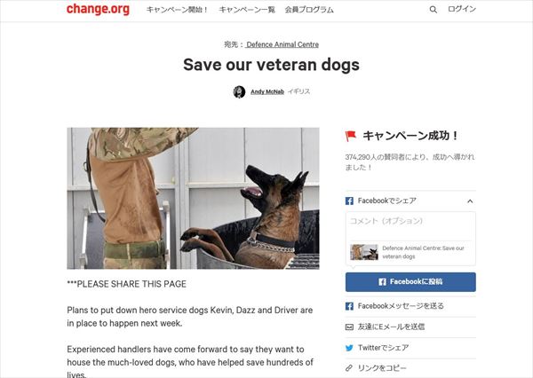 そんな状況をみて、それまで共に活動をしていた兵士たちは黙っていませんでした。兵士たち自身が命を救われてきたからです。例えば、同陸軍のアンディ・マクナブさんは、パトロール中に爆弾に近くにいたようですが、軍用犬が爆弾を見つけてくれたおかげで被害にあうこともなく、「命を救ってもらった」と語っています。