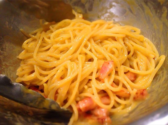 ベーコンはカリッカリに炒めておき、それからパスタ以外の材料と混ぜ合わせるんですね。