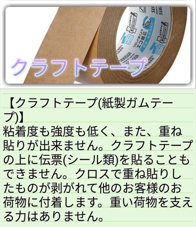 布製ガムテープに対してクラフトテープは粘着力も強度も低いので、重い荷物は支えられないそうです。