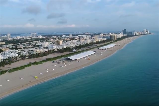 場所はマイアミのサウス・ビーチ。世界中から多くの観光客が訪れる美しく広大なビーチとして有名ですね。そんなビーチの上空を優雅に飛行するドローン。