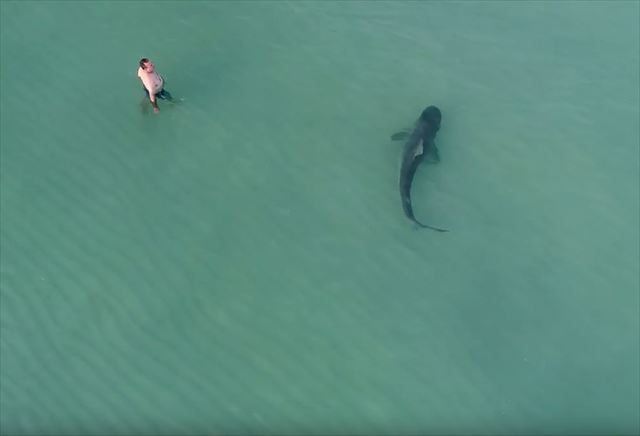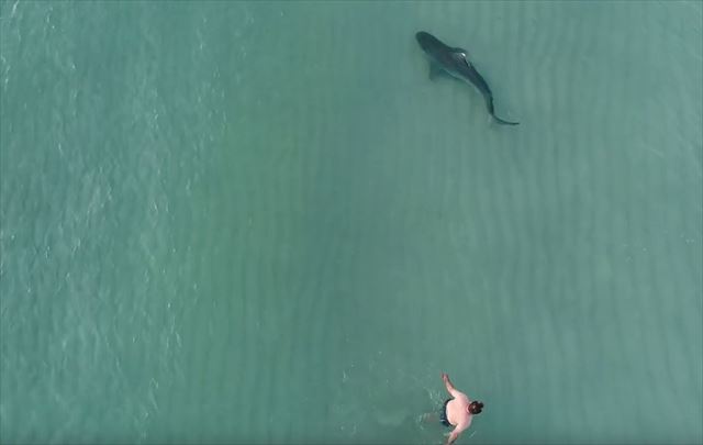 観光客のすぐ横をゆったりと泳ぎます。上空からの映像なので、観光客の表情などは分かりませんが、こんなに近くに人間を襲うサメがいるなんて、怖すぎます。