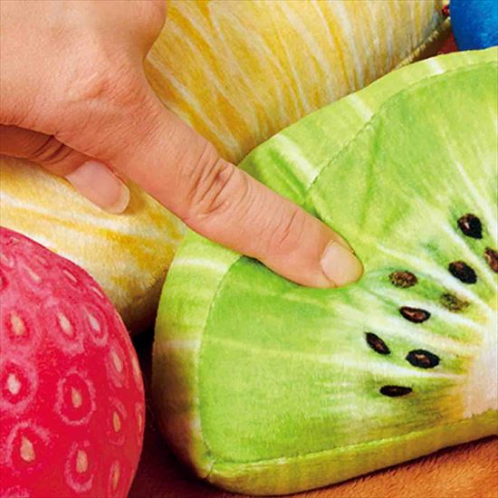 大きさはこのぐらい。タルトカップもフルーツ形クッションも、ふかふかの起毛素材を使用しているそうです。
