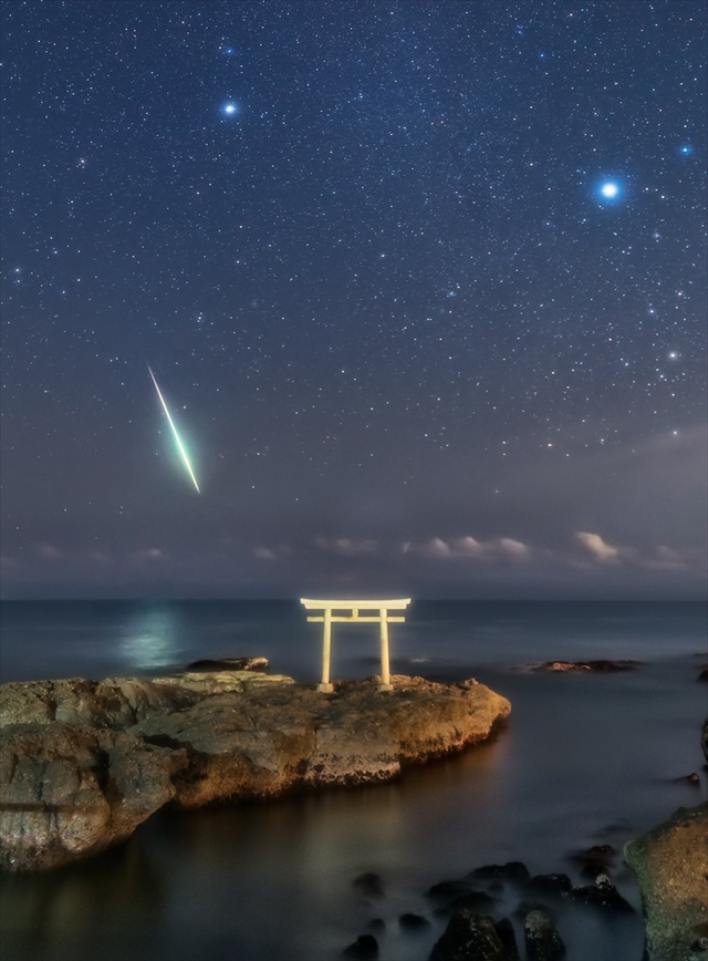 海面に光が反射するほどの明るい流れ星が、鳥居に向かうように流れていきました。