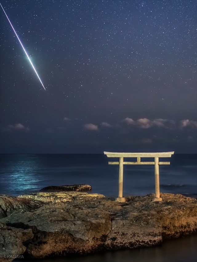 そんな鳥居に向かって、明るい流星が流れる瞬間が訪れました。決定的瞬間を撮影されたのは、星空をはじめ、日々美しい写真を撮られており、写真集も発売するなどご活躍されているTwitter@KAGAYA_11949さん。こちらが話題のツイートです。