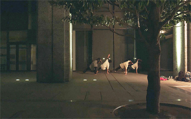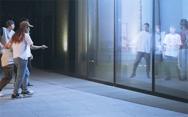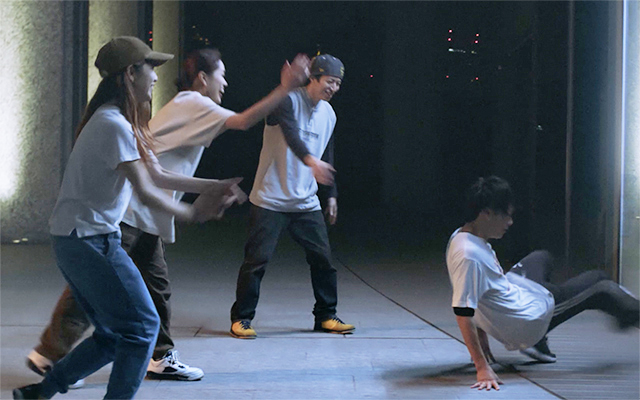 ミラー代わりにビルの窓を使って、自分や仲間の動きを入念に確認。4人の息は、どんどん合っていきます。