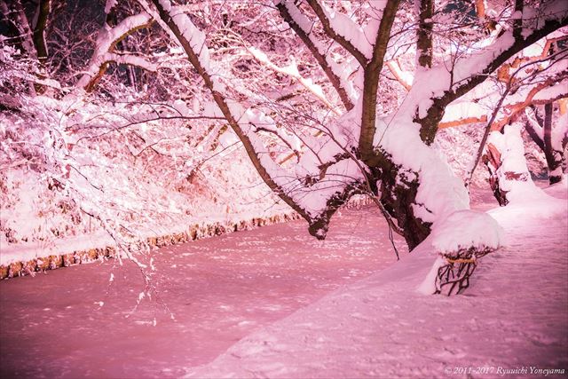 冬の弘前公園外濠は夜間は真っ暗なのですが、街灯がわずかにピンク色に照らす箇所があり、カメラであれば気象条件と設定次第で満開のさくらのように写すことができるのでは?と機会をうかがっていました。