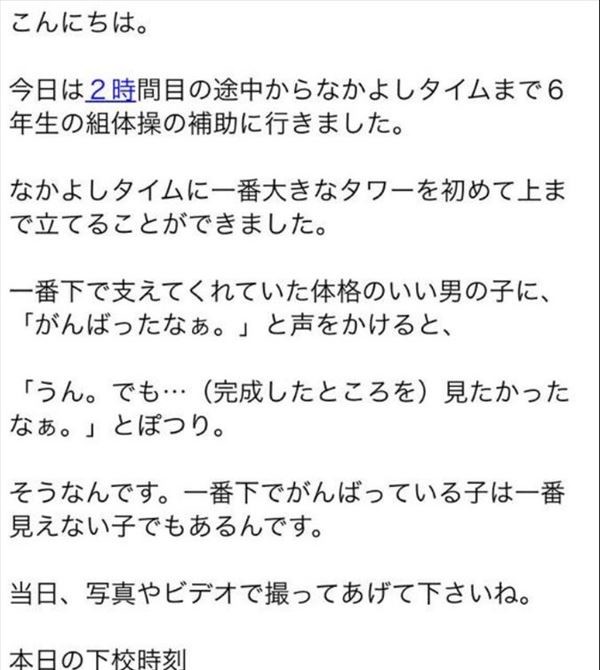 とてもいいメールですね。うちの子が通う小学校も一斉メールが導入されているんですが、機械的で事務的で、なんとも味気ないものでつまらないです。