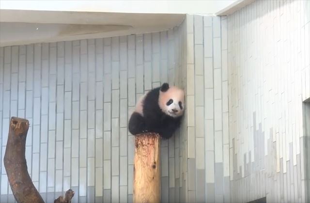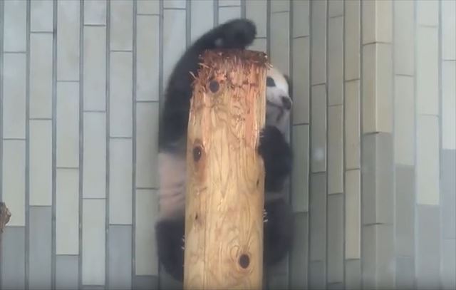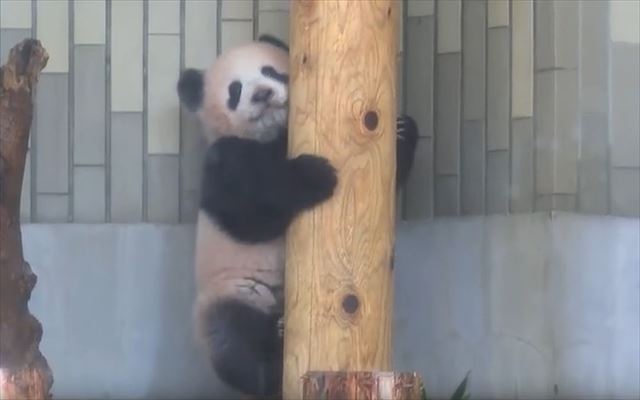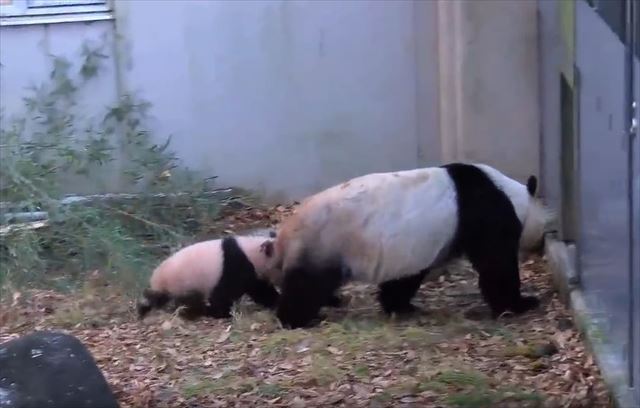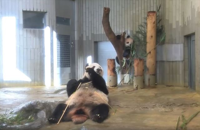 互いにお食事中。シャンシャンは1~3時間起きては3〜4時間眠るという日々だそうです。起きているときは室内を歩き回ったり、木やドアの格子にのぼったり…。随分活発になりました。