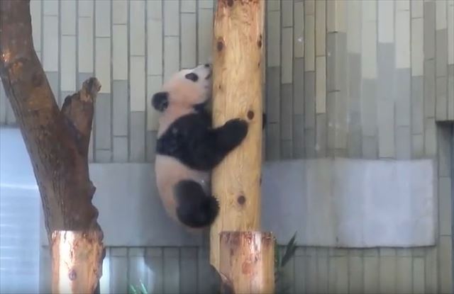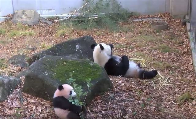 お食事中の母親のシンシンと、なにやら木にのぼって遊んでいるシャンシャン。