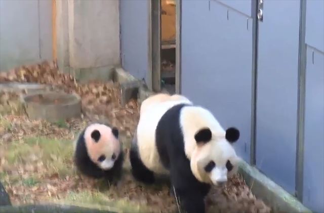 この日は屋外の運動場にも行きます。お母さんの後ろについていくシャンシャン。