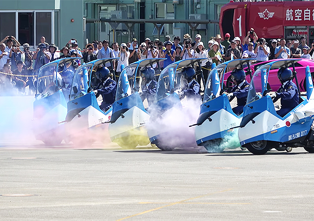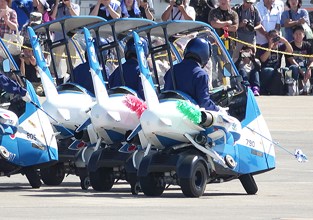 ブルーインパルスJrは、実は原付きバイク。バイクは普通に走るより、スピードを落としてパフォーマンスをするほうが難しいと言われているだけに、数々の技を披露してくれるライダーの技術には目を奪われるばかりです。