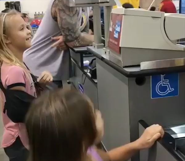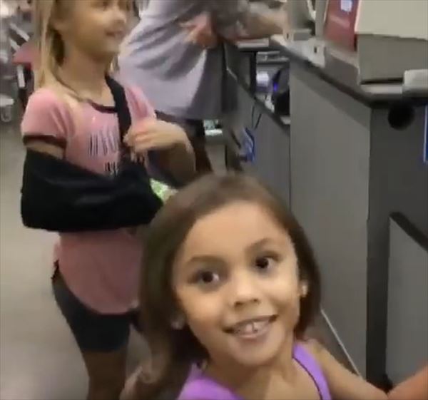 コストコのレジに並ぶ子どもたち。何やら、レジを打っている店員が気になるのか!?笑顔を浮かべています。