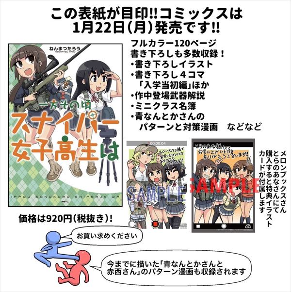 今回ご紹介したイラストを描いたねんまつたろうさんの漫画『一方その頃スナイパー女子高生は』が1月22日から絶賛発売中です!