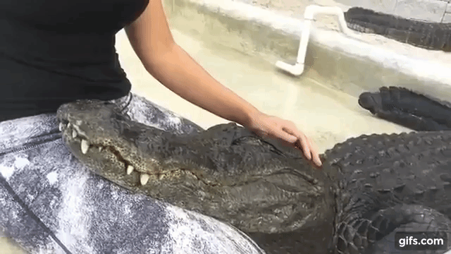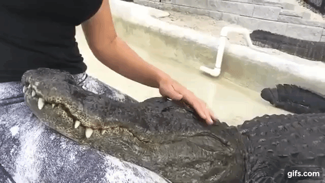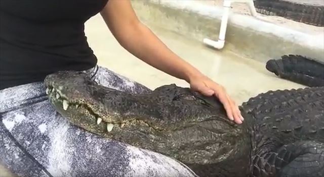 大きなワニを膝の上にのせ、頭の上を優しくなでています。ワニは眠っているのでしょうか。動画で見てみてもほとんど動きがなく、とても心地よさそうに見えます。