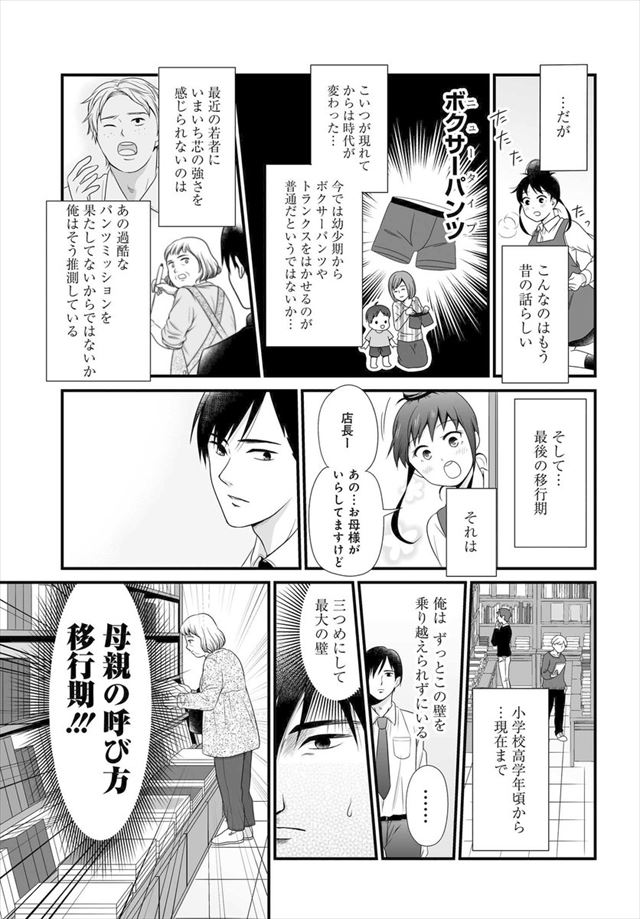大人の男になる条件として、「一人称移行期」「下着移行期」「母親の呼び方移行期」など、3つのステップで表現されています。着眼点といい、すごく分かりやすい表現の仕方ですよね。漫画を読み終えたときに思わず納得させられました。