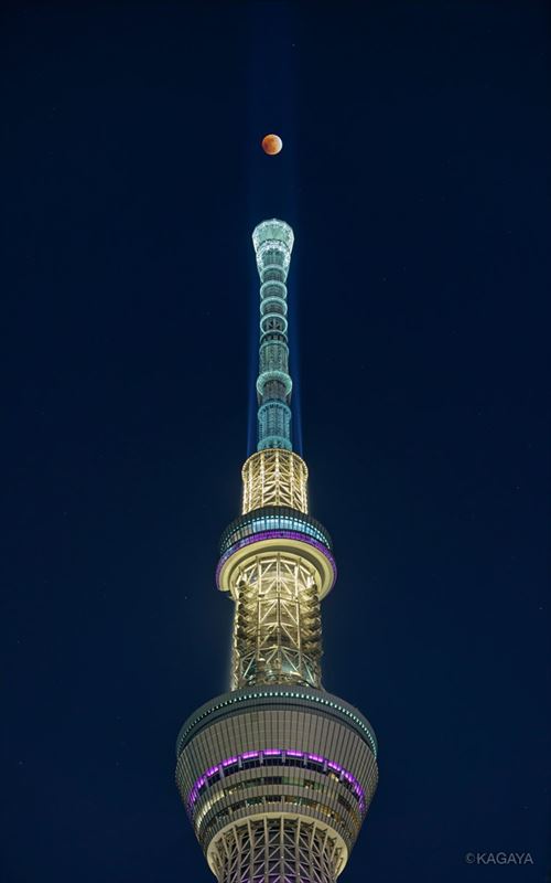 キラキラと輝くスカイツリーの真上に皆既月食のお月さまが浮かんでいて、めちゃくちゃ美しい!