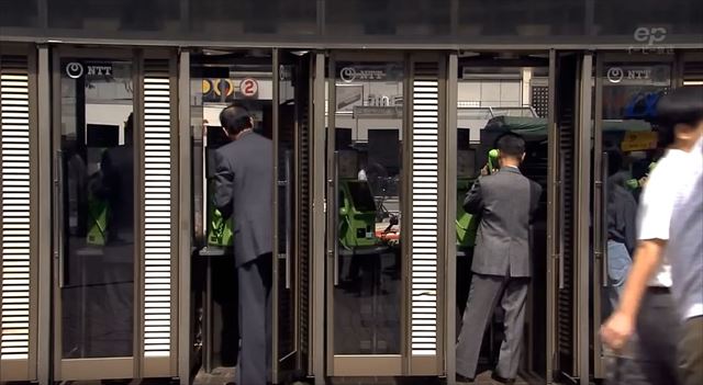 携帯電話がなかった時代。電話ボックスに並ぶビジネスマンの光景も懐かしいです。