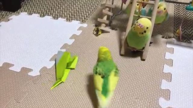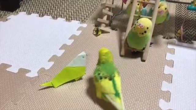 飼い主さんが折り紙のインコを出してすぐに、ぴーちゃんが近寄り…