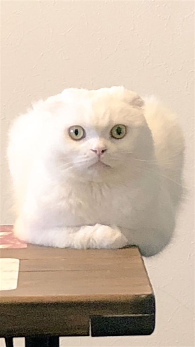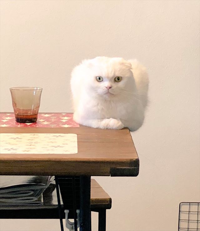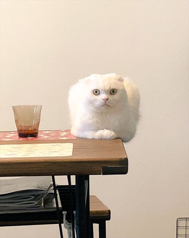 テーブルの隅っこに座っていますが、少しはみ出てます…。バランス感覚に優れていますね!?そして、まっすぐで力強い目線といい、なんとなく全体が四角く見える!?感じといい、あらゆる角度からツッコミどころが満載です。