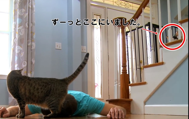 動画をよーく見ると、階段のところで全く動じないロキが映っていました。「なーにやってんだよ。」って感じで終始クールな様子がまた萌えますね!