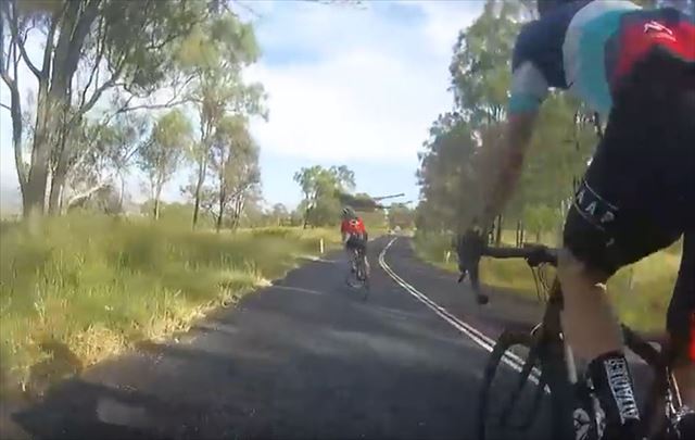 場所はオーストラリアのクイーンズランド州。この時点で既にピンときた方もいるでしょうか。サイクリング中に何かが右側から飛んできます。それもものすごい勢いで…。次の瞬間でした…!!