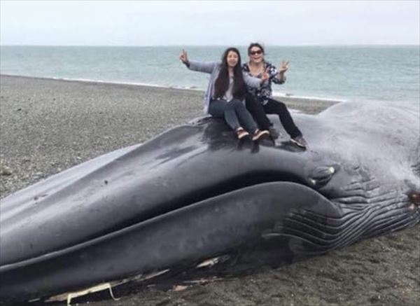 クジラの亡骸に腰掛けて記念撮影をする観光客の画像が投稿され、多くの非難の声が集まっています。