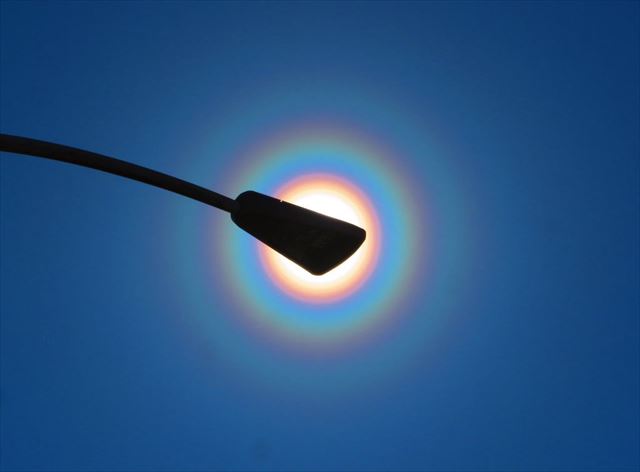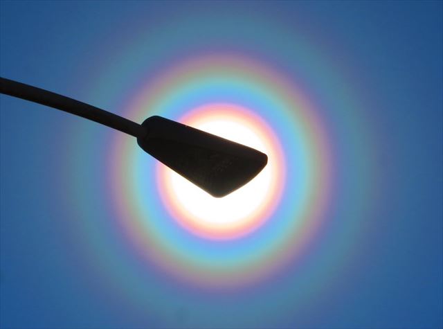 見た目は不思議であり美しくもある光景です。円形の虹のようにも見えます。花粉光環とは、太陽の光が花粉の粒子の影響によって曲げられることにより発生。すなわち、花粉が大量に飛散していることを表すサインなのです。