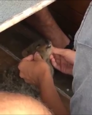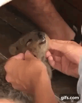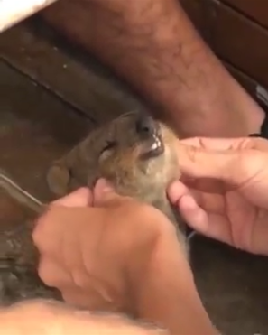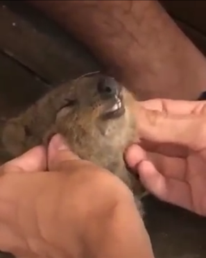 男性の手の中に、ちっちゃなクアッカワラビーの顔。そのこねこねしているところを、さらにズームアップしてみると…
