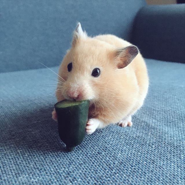 頰袋にキュウリを詰めるアクションはまさにマジック!?その一方で、小さな体で大きな食べ物を一気に食べるときには喉に詰まらせないか心配になる時もありますよね。いずれにせよ、ハムスターの可愛さが詰まっていた画像でした♪