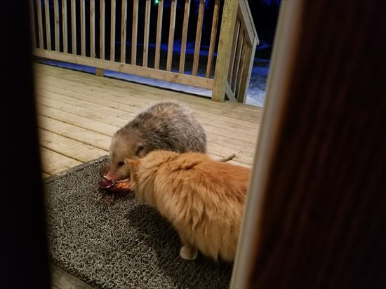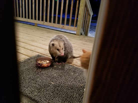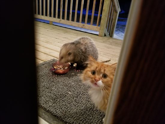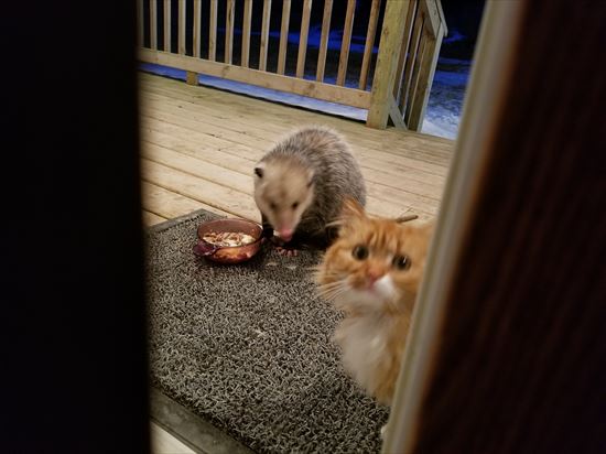 ポッサムさん、ニャンコのエサを奪っちゃダメよ~。返してあげて~。