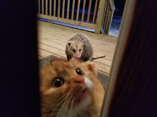 何が起こったのかというと、なんとニャンコの目の前にいるポッサムという小動物が、真剣な眼差しでエサを横取りしようとしているのです!