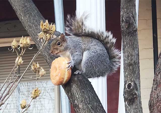 そこまでもってくー?とツッコミたくなるぐらい、高い所でドーナッツを抱えているリスちゃん。木の上なら、誰にもドーナッツを盗られることなく食べれると思ったのでしょうか。木の上で必死にドーナッツを頬張るリスちゃんが可愛すぎてキュン死レベルと話題になっているのでご紹介します。