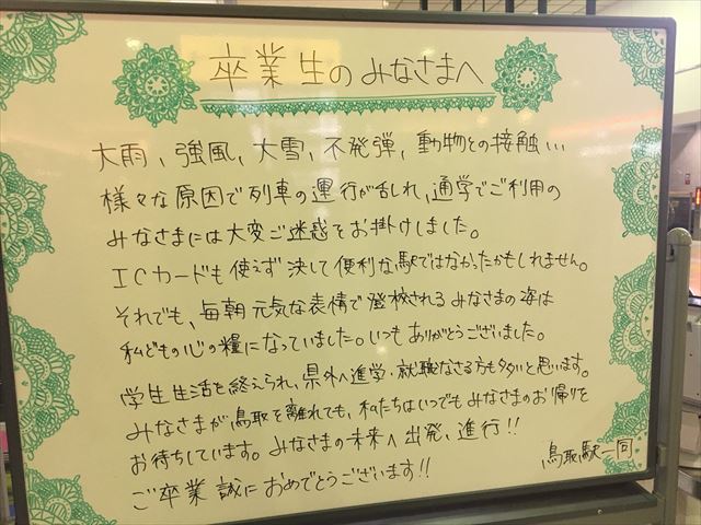 鳥取駅駅員の地元愛にあふれたメッセージ。卒業生のみなさんの心にも、深く刻まれたのではないでしょうか。