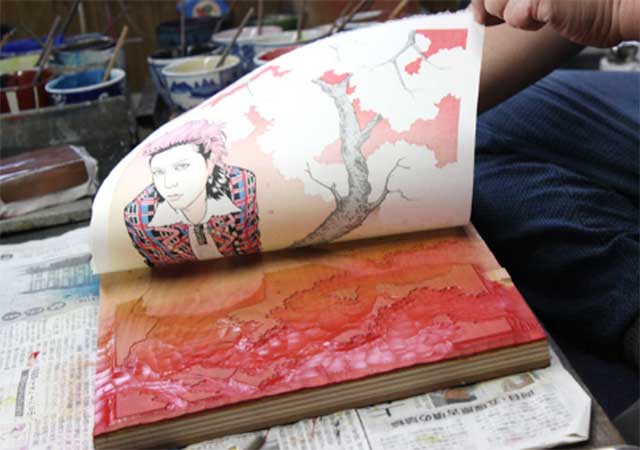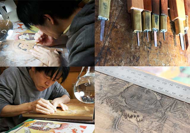 絵師が何枚もラフを書いた後は、彫師が色ごとに版を制作。大小さまざまな彫刻で髪の毛や顔などの輪郭を掘ります。無駄のない枚数で原画と同じ色が再現できるかは、彫師の経験によると言われています。