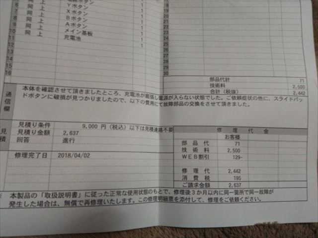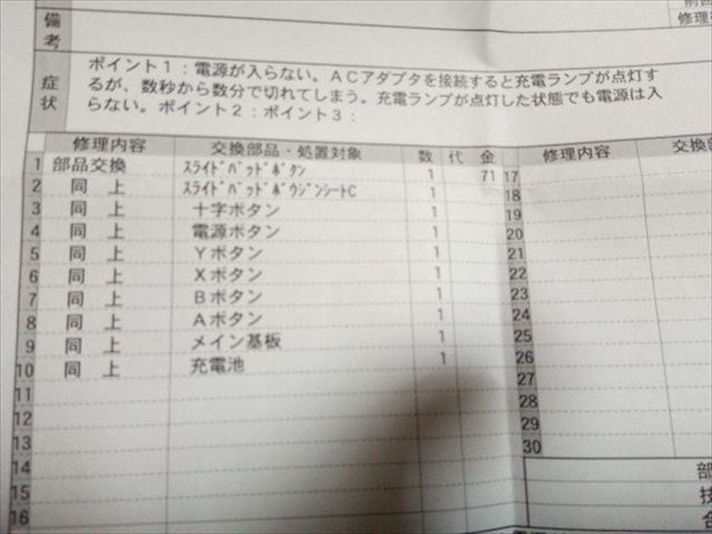 なんと、メイン基板と充電池を交換してくれただけでなく、その他の部分も交換してくれていたとのこと。しかも金額は71円!まさに“任天堂の神対応”です。