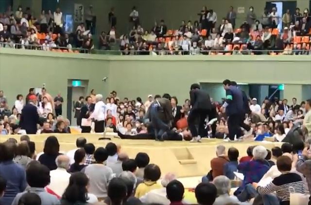 しかし、ここで場内に鳴り響いたのは「女性は土俵から降りて下さい」というアナウンス。女性たちは市長の容態を心配しながらもアナウンスに従い、土俵から離れていきます。このアナウンスに対して会場全体もざわついている様子。