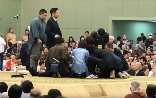 観客としてきていたという女医の方が土俵に上がり、心臓マッサージを行っています。