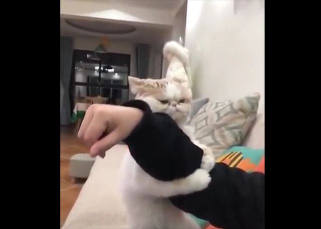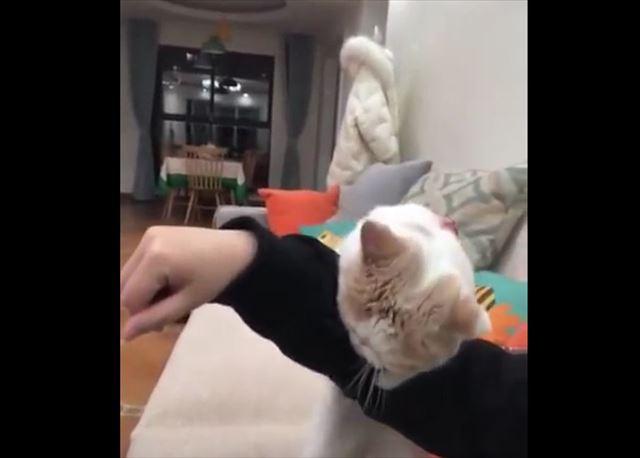 飼い主さんの腕をつかみ、立ち上がったままの姿勢のニャンコ。その後、飼い主さんが腕を動かしてみたりしますが、ニャンコはがっちりと腕をつかみ、持ちこたえます。