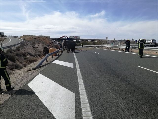 Se está procediendo a la asistencia y evacuación de los elefantes heridos en el accidente que ha tenido lugar en Albacete. De los cinco paquidermos hay uno muerto y dos heridos. En breve de restablecerá la circulación en la A-30 en el pk 22/23. pic.twitter.com/fhGypNDYGm