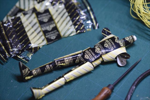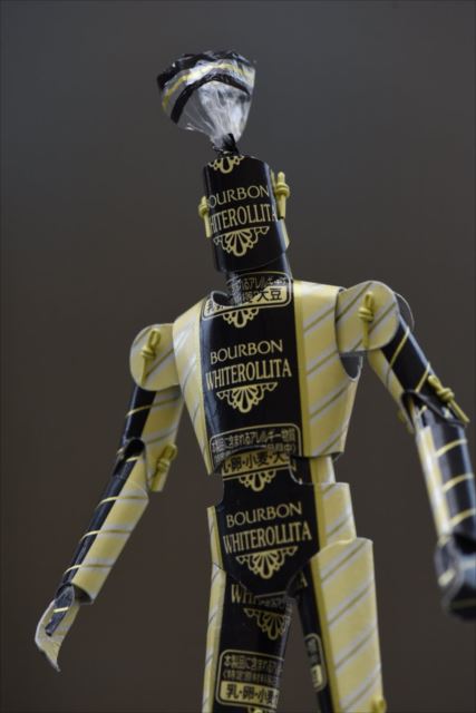 ブルボン「ホワイトロリータ」の包み紙を厚紙に貼って針金でつないでカミロボにしました。
