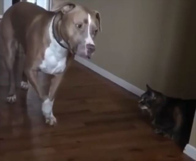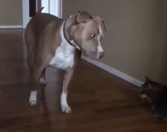 その後、おそるおそる足を前に出し、ゆっ~くりとニャンコの前を通り過ぎていきます。よく確認はできませんが、ニャンコがピットブルににらみをきかせているのでしょうか。