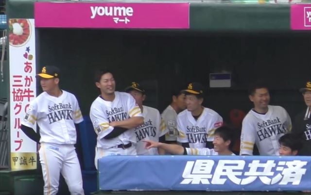 コロッケさんのショーにはスタンドのお客さんだけでなく、ソフトバンクの選手らも釘付け。ベンチではたくさんの笑顔が見られました。