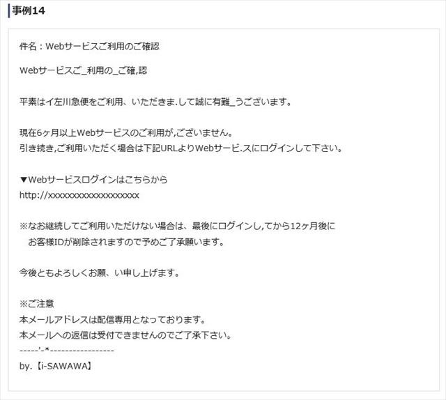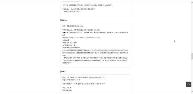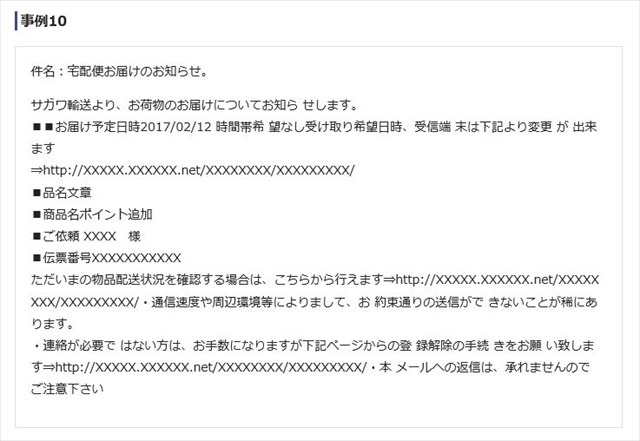 佐川急便のサイトにも「佐川急便を装った迷惑メールにご注意ください」と呼びかけ、さまざまな事例を掲載していました。その数は実に20パターン近く…。