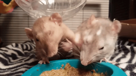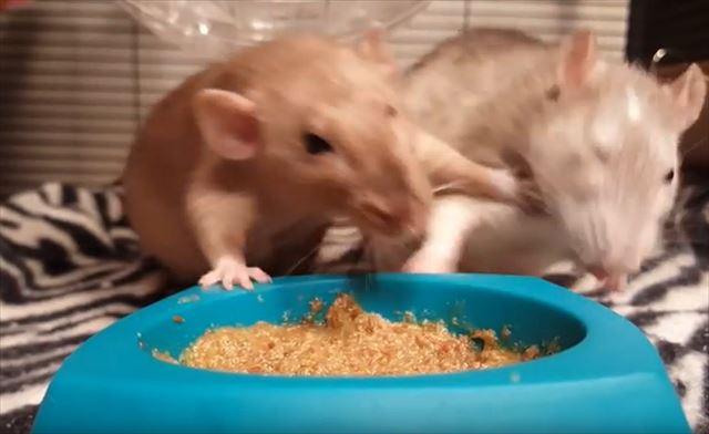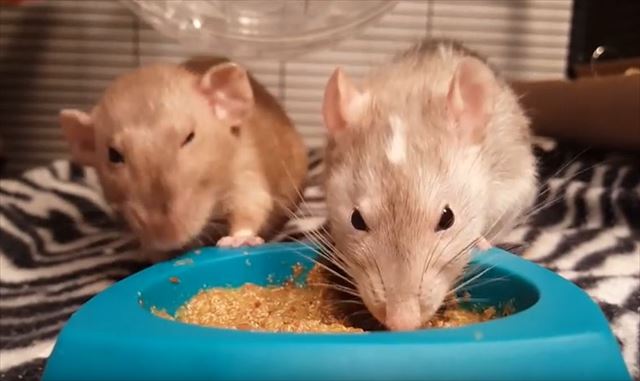 向かって右側のネズミがおいしそうにエサをもぐもぐ食べています。その様子を後ろでもう1匹のネズミが見ているかと思いきや突如…